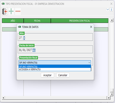 En la barra de herramientas existe una nueva opción para indicar la presentación fiscal a la que se acoge el obligado tributario, accesible desde CONFIGURACIÓN DE CIERRES > PRESENTACIÓN FISCAL. Los valores incluidos en la opción son los siguientes: