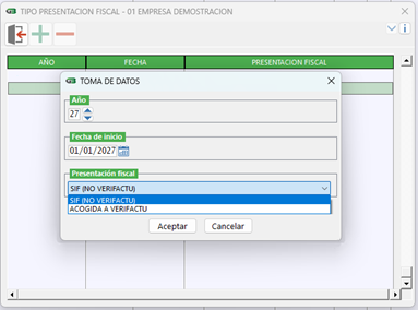 • Presentación fiscal: opción de la aplicación desde la cual se configura la empresa, para identificar la modalidad a la que estará acogida. Pudiendo seleccionar la opción acogida a SIF, identificando el año y la fecha de inicio de la misma.