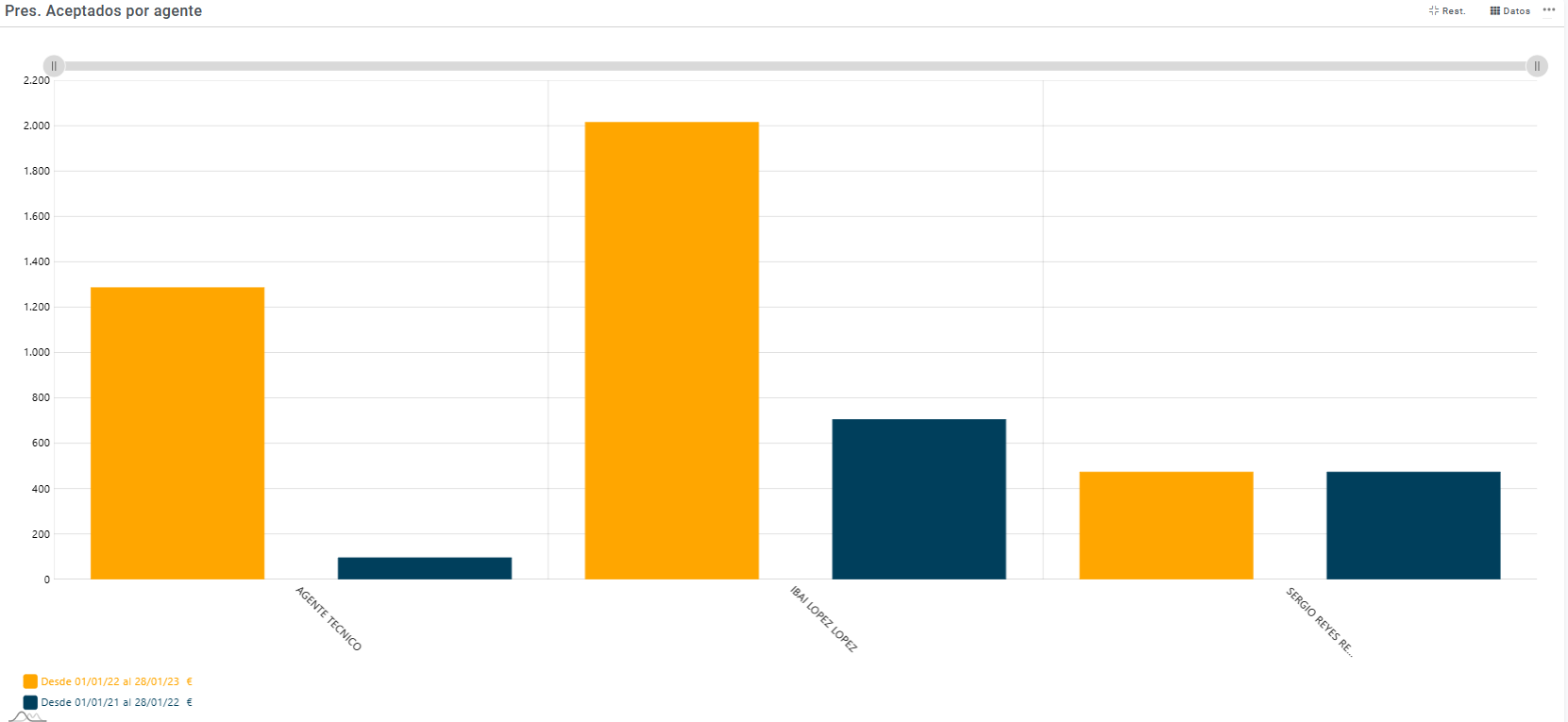 Importe total de los presupuestos aceptados de venta agrupados por agente del periodo actual. Esta gráfica muestra una comparativa con respecto al periodo anterior.