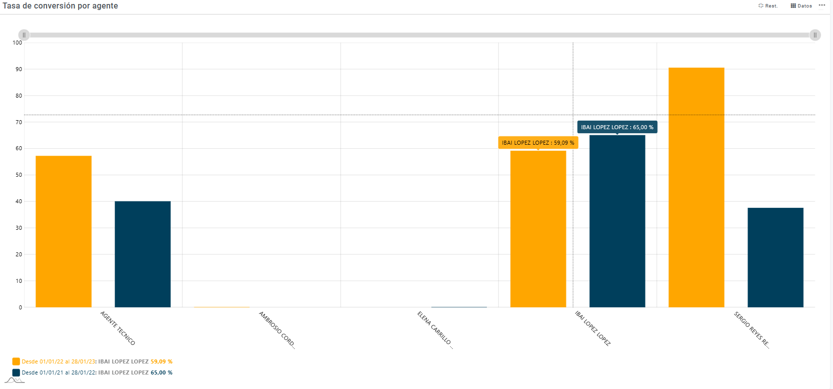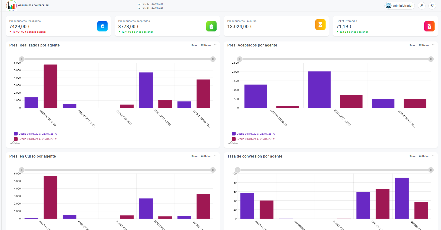Porcentaje de presupuestos aceptados que se han sido realizados, agrupados por agente durante el periodo configurado como actual. Esta gráfica muestra una comparativa con respecto al periodo anterior.