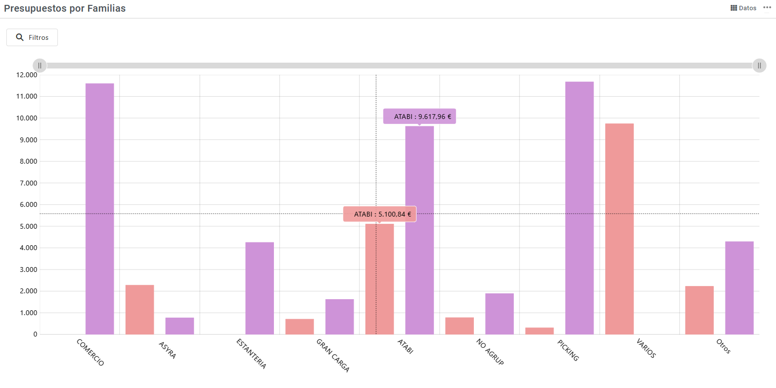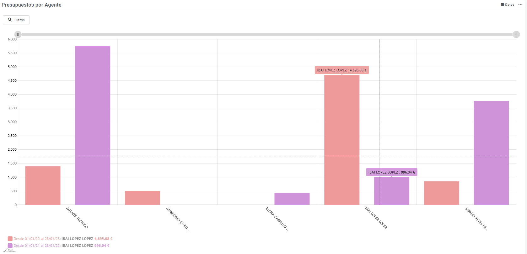 Importe total de los presupuestos de venta en curso agrupados por agente del periodo actual. Esta gráfica muestra una comparativa con respecto al periodo anterior. Se entiende por presupuesto en curso presupuesto con estado 1 y que no cumpla algunas de las siguientes condiciones: