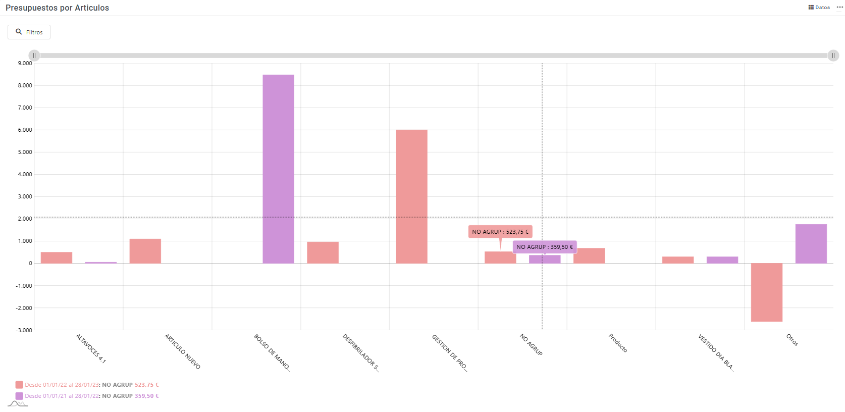Importe de ventas agrupadas por artículo diferenciando entre el periodo actual y el periodo anterior configurados en la aplicación. En está opción podremos realizar filtros sobre la información que nos muestra estos filtros pueden ser: