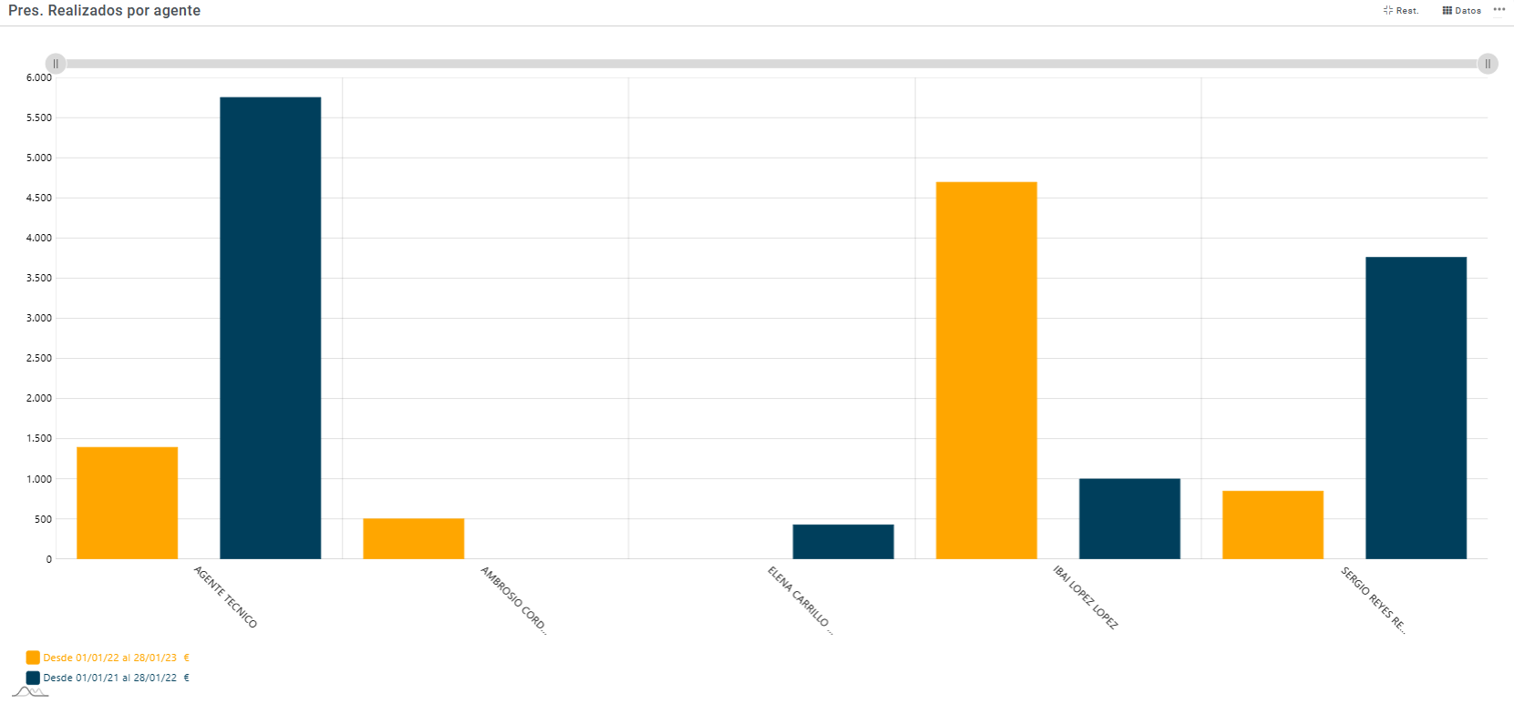 Importe total de los presupuestos aceptados de venta agrupados por agente del periodo actual. Esta gráfica muestra una comparativa con respecto al periodo anterior.