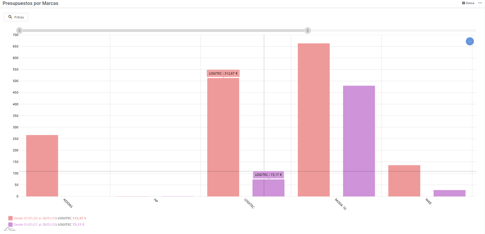 Importe de ventas agrupadas por marca diferenciando entre el periodo actual y el periodo anterior configurados en la aplicación. En está opción podremos realizar filtros sobre la información que nos muestra estos filtros pueden ser:
