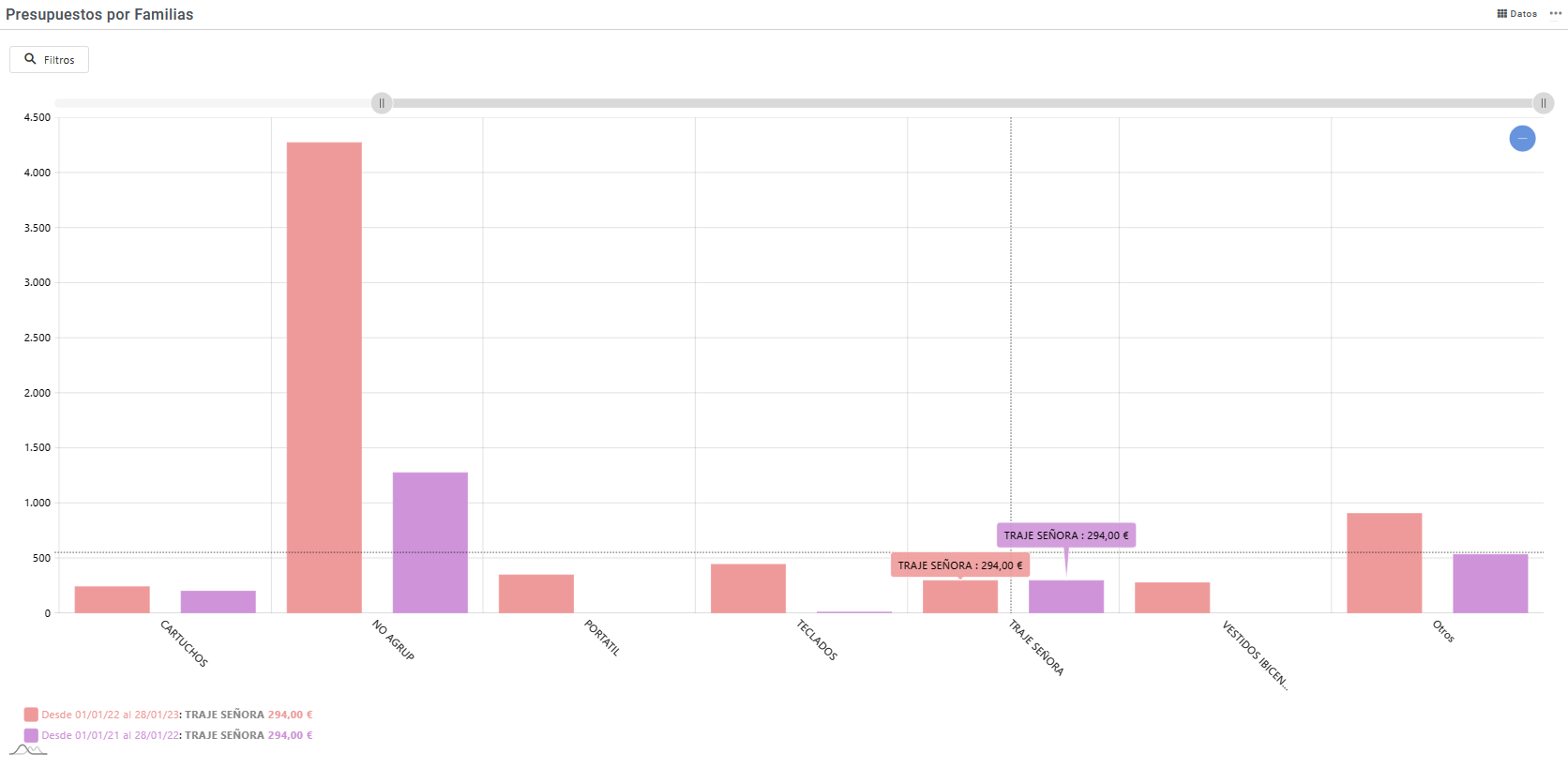 Importe de ventas agrupadas por familia diferenciando entre el periodo actual y el periodo anterior configurados en la aplicación. En está opción podremos realizar filtros sobre la información que nos muestra estos filtros pueden ser: