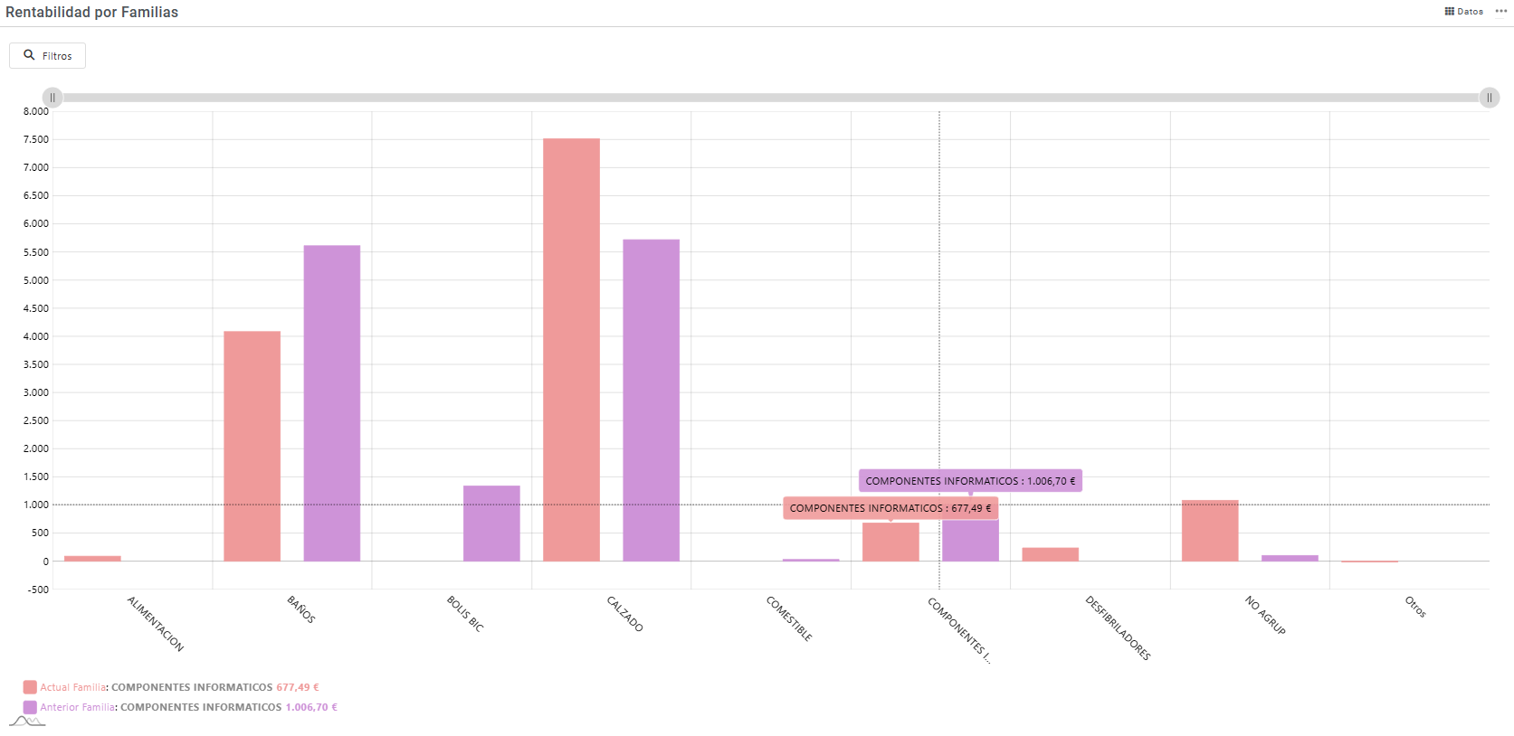Importe de ventas agrupadas por familia diferenciando entre el periodo actual y el periodo anterior configurados en la aplicación. En está opción podremos realizar filtros sobre la información que nos muestra estos filtros pueden ser:
