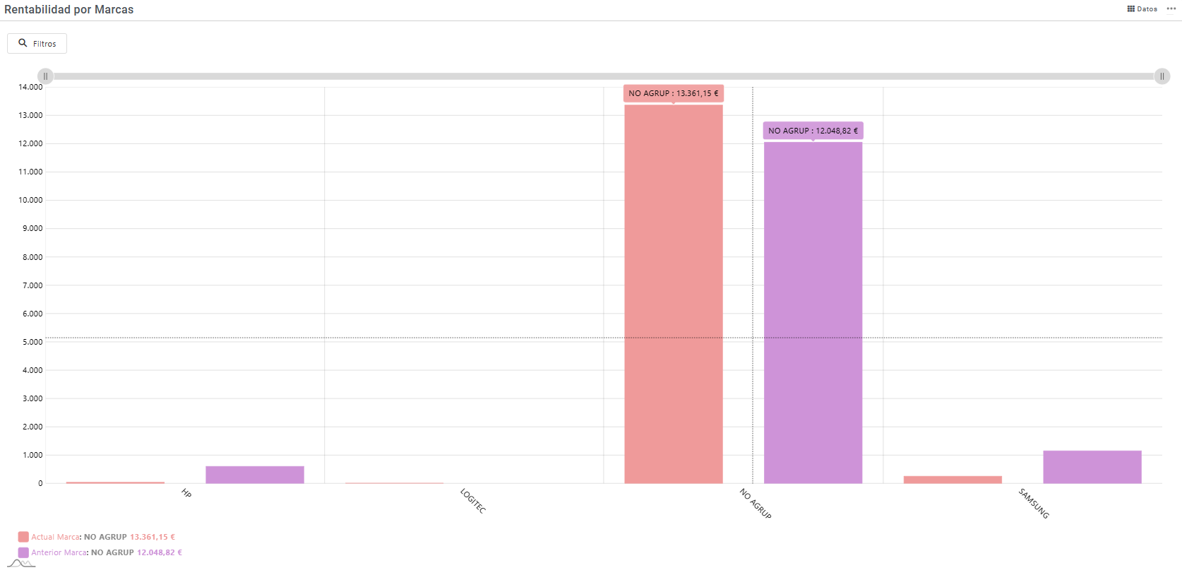 Importe de beneficios agrupados por marca diferenciando entre el periodo actual y el periodo anterior configurados en la aplicación. El cálculo está recogido de los movimientos de salidas (facturas de venta y albaranes). La formula del beneficio recogido es: