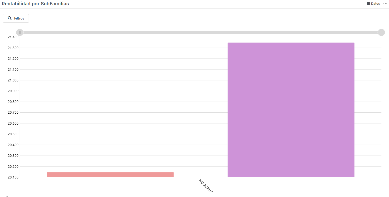 Importe de ventas agrupadas por subfamilia diferenciando entre el periodo actual y el periodo anterior configurados en la aplicación. En está opción podremos realizar filtros sobre la información que nos muestra estos filtros pueden ser: